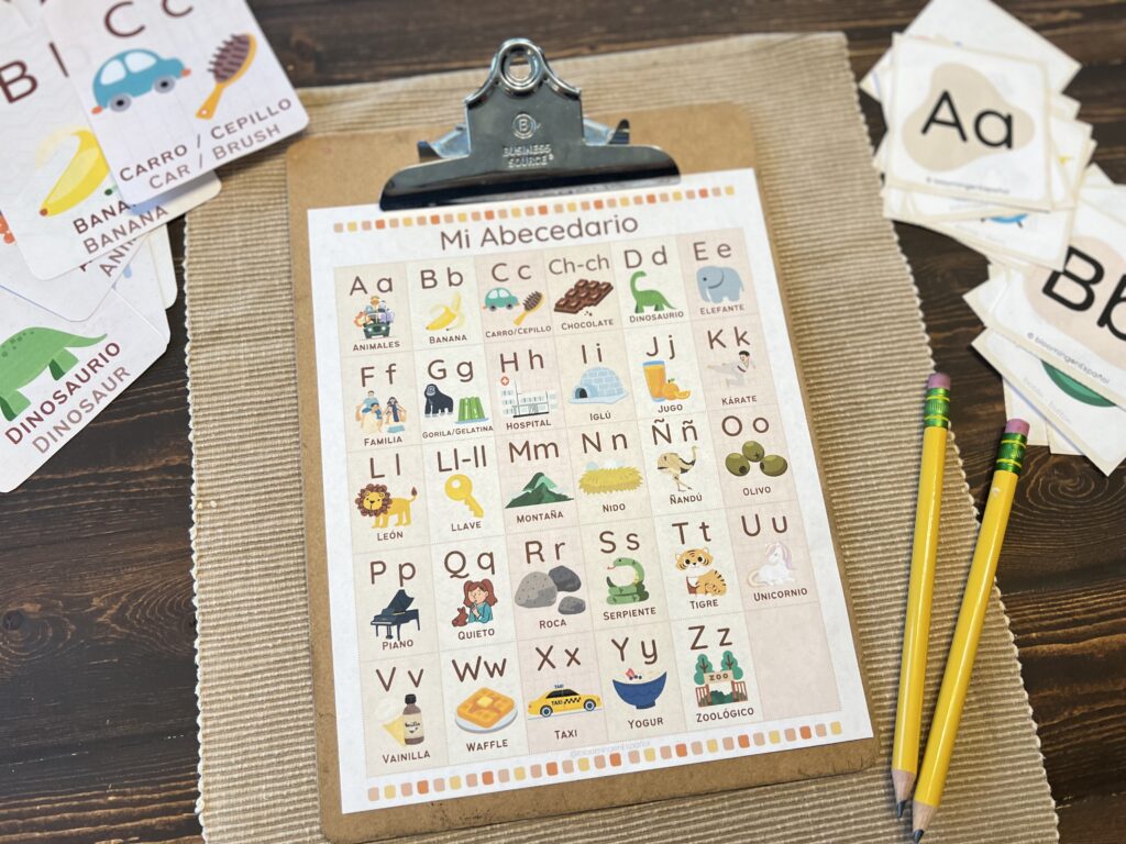 One of my favorite methods for linking the target sound to its corresponding letter is through flashcards. Our flashcards are an ideal option, as they feature pictures that serve as cognates in both English and Spanish. This makes them perfect for our bilingual children, allowing them to draw connections between the two languages.