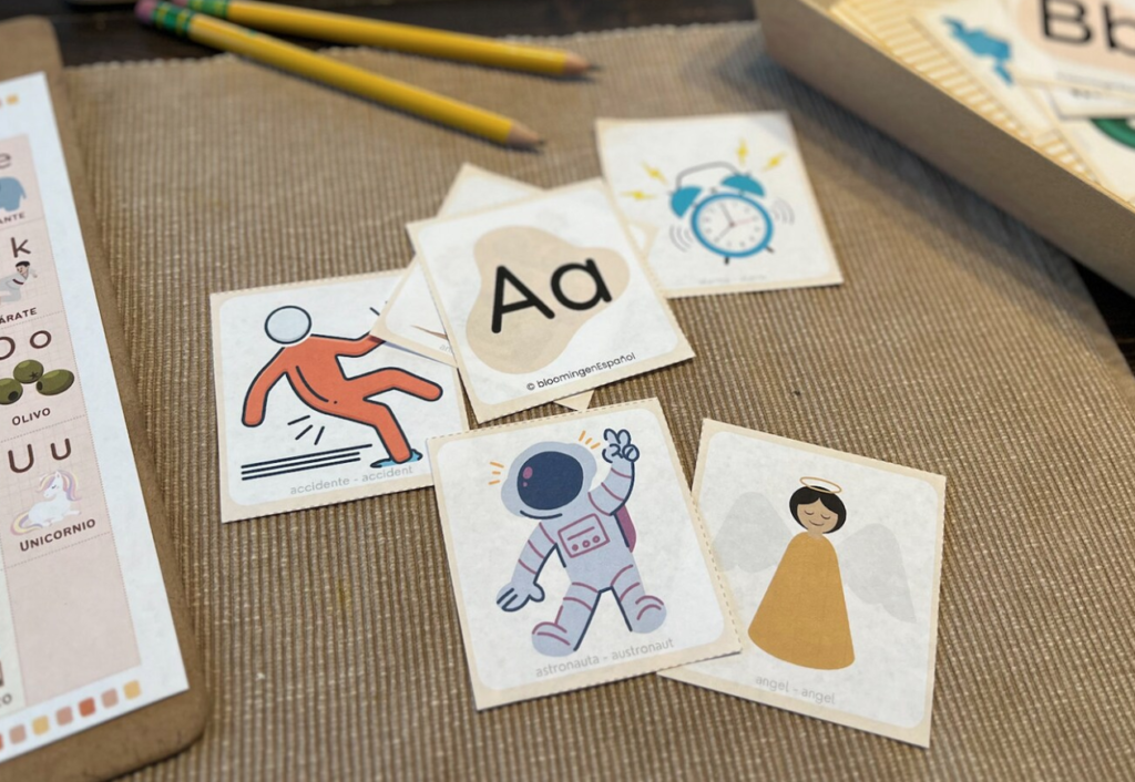 Use Picture Cards to Reinforce Target Sound – Our picture cards contain some images that are cognates in English and Spanish. Meaning that they are words that are related. (Astronauta – Astronaut) These are a great tool for bilingual students.